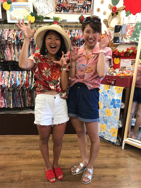 すごく仲良しなお二人で、赤のボタニカルハイビーのお客様、最初は普通にシャツを着ていたのですが、ちゅら島紅型のお客様のアロハな着こなしを見て「それイイ!やりたい!!」と同じ着こなしでおそろコーデばっちり決まりました☆