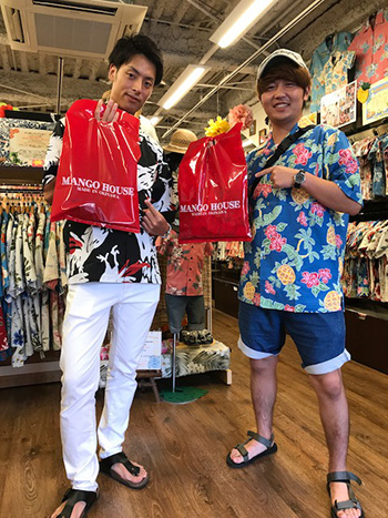 最初に気に入って着替えた柄は沖縄らしい元気色の【紅型パイン】!!(右のお兄さん)