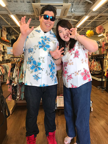 先日お母様がかりゆしウエアをお買い上げで娘さんも気になりご夫婦でご来店!