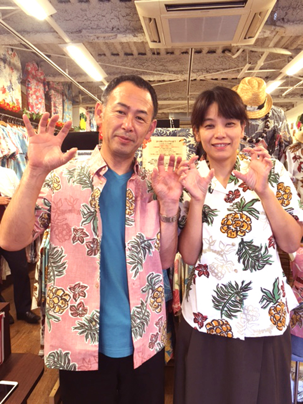 以前沖縄へ訪れた際に マンゴハウスでかりゆしウェアを買って下さった リピーターさんです♪2度目のご来店♪