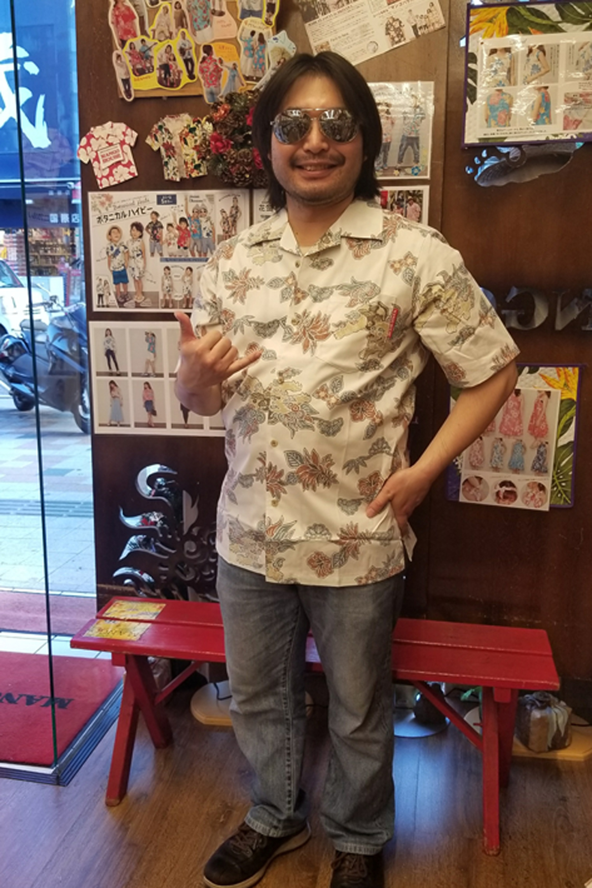 アロハシャツが好きでよく着るそうですが、かりゆしウェアは持っていないので、今回が初!かりゆしウェアです
