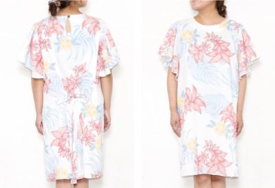 フレアスリーブワンピース デイゴプルメリア(フリーサイズ)