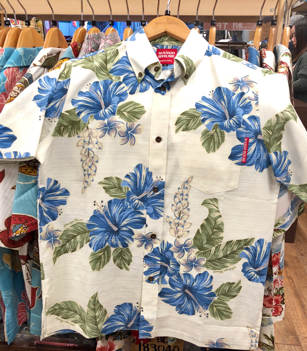 そんなオシャレなお兄さんたちが選んでくれた、沖縄アロハシャツがこちら~! カーニバルハイビー/オフブルー