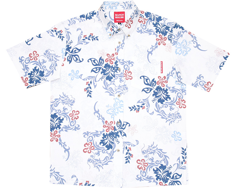 トライバル調にデザインされたドラゴンとハイビスカスが見事にマッチし、華やかさとかっこよさが目を引くアロハシャツ(かりゆしウェア)。