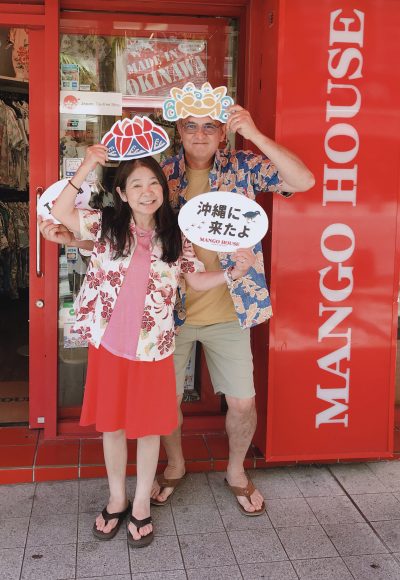 今回で、マンゴハウスのかりゆしウェアは2着目だそうです(*^_^*)!ありがとうございます♪ スタッフ手作りのフォトプロップス(吹き出しポップ)を見て、『これで写真撮りたかったんだー!インスタグラムも、フォローしてるよー!』と、おっしゃって下さって、シマブクロは感激です\(^o^)/!!! SNSって県外どころか世界中で繋がってるんだー♪と改めて実感した瞬間でしたね☆ こうやって、遠い所に住んでるお客様とも繋がれるって幸せですね(*^_^*)。 ぜひ、カリフォルニアでもかりゆしウェアを愛用して下さいね~!!