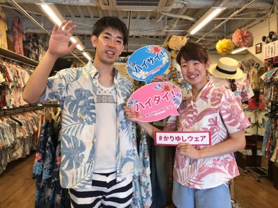 そして、お二人がき着てるのは〝月桃モンステラ〟(裏地使用)わざとハッキリとした表地をあえて生地のかすれ具合の風合いを楽しむ裏地を表出したデザインです!