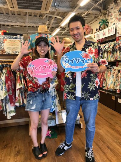 「沖縄着いたらやっぱりアロハでしょー♪」と早速仲良くお二人でデザインチェック!