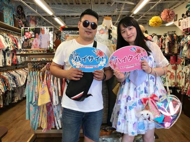 中国のお客様が沖縄のかりゆしウェアをゲット。中国から仲良しなカップルがご来店🌺