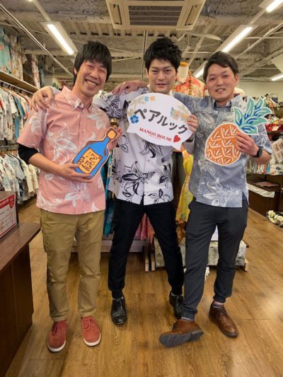 マンゴハウスでは数多のかりゆしウェアが並んでいるので、あんまり見慣れない方は選ばれるのに苦戦される方が多いのですが、お兄さん方は再来店とのことで下見もバッチリ!!