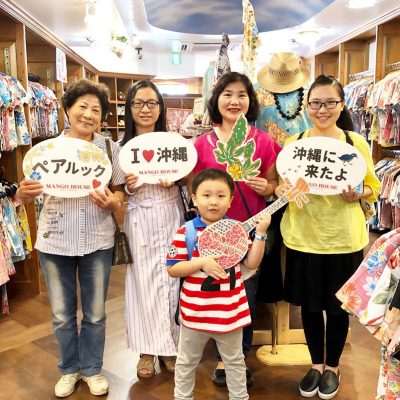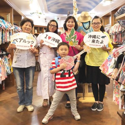 1番左のお母様が、ブラックの沖縄アロハシャツをお探ししていたご様子。