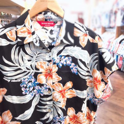 色々試着して、選んでくれたのは、グレイスハイビーブラックの沖縄アロハシャツ![]()