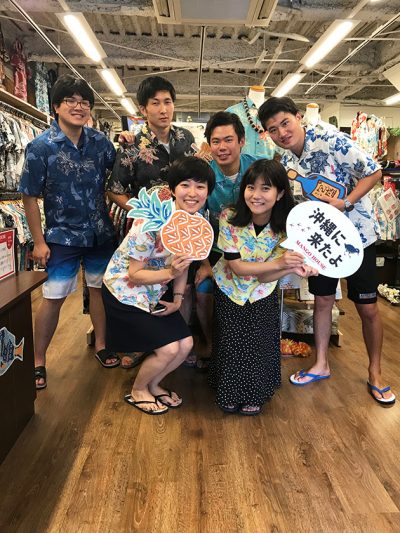全員でシーサー合わせですよ♪沖縄エンジョイしてます感がすごい!後方の列の左から二番目のお兄さんがぐすーじシーサーをGETいたしました✨ぜひぜひ滞在中着替えられてくださいね( *´艸`)