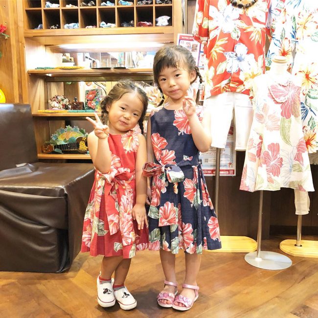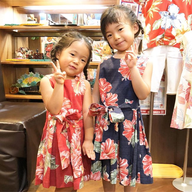 おさげもお揃いで、キッズ沖縄アロハワンピースもお揃い![]()