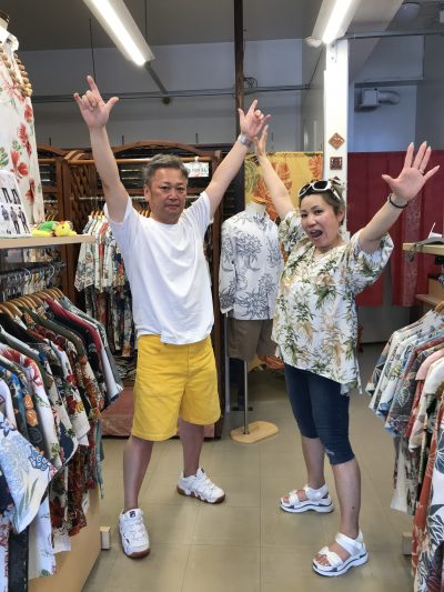 前回は那覇の店舗で「カラフルハイビー」をお揃いで選ばれたそうで、今回もお揃いで「フレッシュデイゴ」と、旦那様は長袖の「がんばるヤンバルクイナ」もゲットです![]()