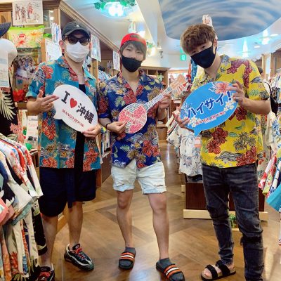 仲良し3人組沖縄アロハシャツはお揃いで選んでいきました♪