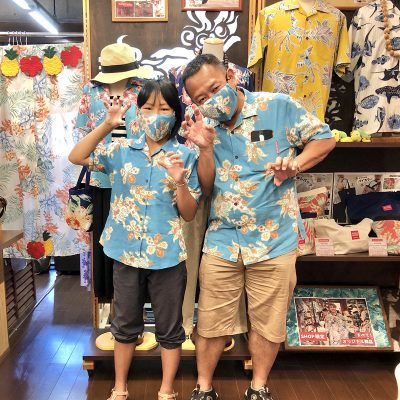 リピーターさんがご来店♪自作のオリジナルマスクとお揃いの沖縄アロハシャツ♪