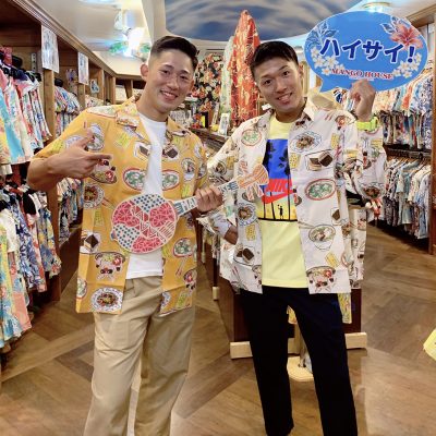 埼玉県からのお客様、ご来店して一目惚れで沖縄らしさ抜群のアロハシャツを選ばれました♪