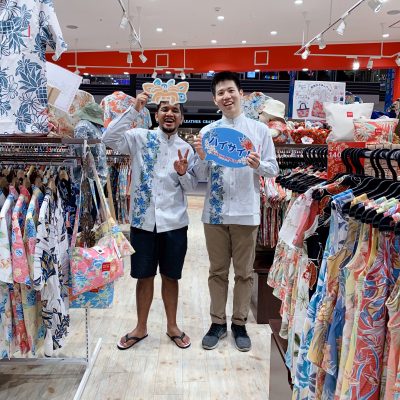 お二人、沖縄のかりゆしウェア選びは楽しく♪どのデザインガお互いに似合うか、あてながら吟味。