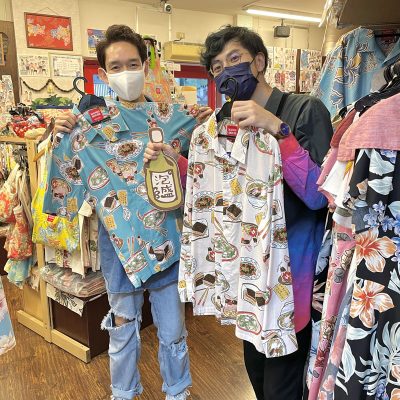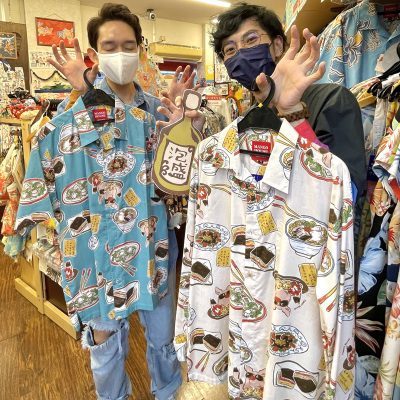 実は、右側のお客様のおばあさんが当店をご存じだったそうで、お兄さんも柄シャツ好きで「かりゆしウェア」が気になっていて今回ネットを見て絵柄のピックアップをしていたんだそうです😃✨