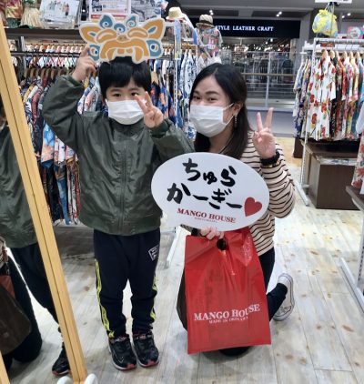 この日は甥っ子さんと一緒に、ハワイで待つ旦那さまへのプレゼントをお探しでした♪旦那さまはなんと、ハワイで週に一回アロハシャツデーの時にマンゴハウスのかりゆしウェアを着てくださっているそうです ! !