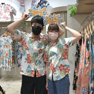 ジャガードの綺麗なかりゆしに釘づけのお姉さんでしたが、