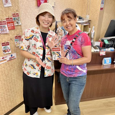 そして、私の着ているかりゆしウェアハッピーシャークと乾杯 のステッカーも選んでくださり、一緒に写真を撮らせていただきましたぁ〜♪