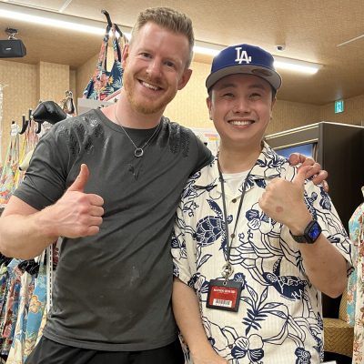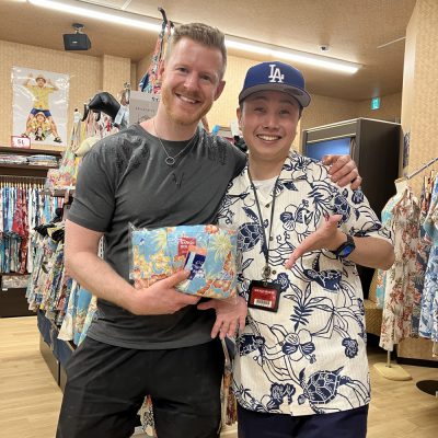 【奥さまとお揃い柄のかりゆしウェアを選んで下さり、対応したスタッフと記念撮影♪📸】