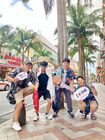 ヤシの木と国際通りとかりゆしウェアを着たお兄さんたちが楽しそうで素敵なお写真♪