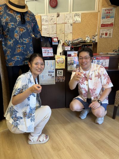 沖縄に来た記念に二人仲良く色違いの人気柄『いちゃりばシーサーパイン』を選んで頂きました。