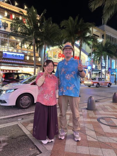 マンゴハウスで夫婦お揃いのシーサー柄かりゆしウェアを選んでいただきました