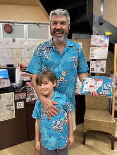 沖縄ならではのシーサー柄かりゆしウェアのお揃いを親子で着用されてご来店