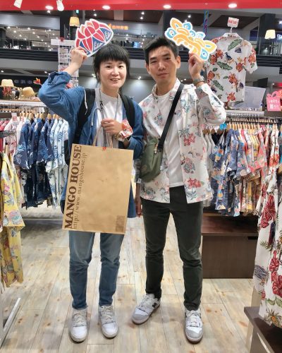 海外からご観光でいらしたカップル様!シーサーとヤンバルクイナ柄に決定♪