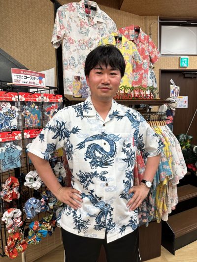 柄シャツ好きなお客様、カッコいいドラゴン柄のかりゆしウェアを纏って沖縄を楽しみます!