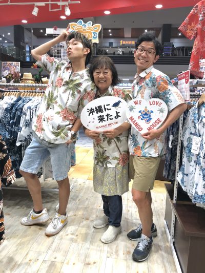 楽しく鏡の前でポージングを 取りながら試着お仕事も兼ねて、観光中のファミリーご来店