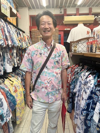 ボタンダウンがお好きだそうで、今回はサンゴ柄のNEWかりゆしウェアをGET♪