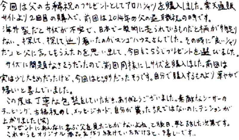 - 父の古希祝のプレゼントとしてアロハシャツを購入しました。