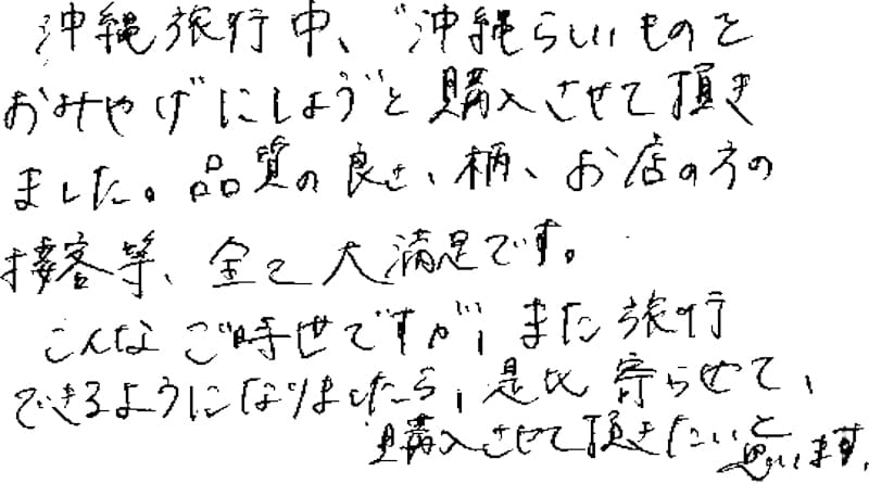 沖縄旅行中、”沖縄らしいものをおみやげにしよう”と購入させて頂きました。品質の良さ、柄、お店の方の接客等、全て大満足です。