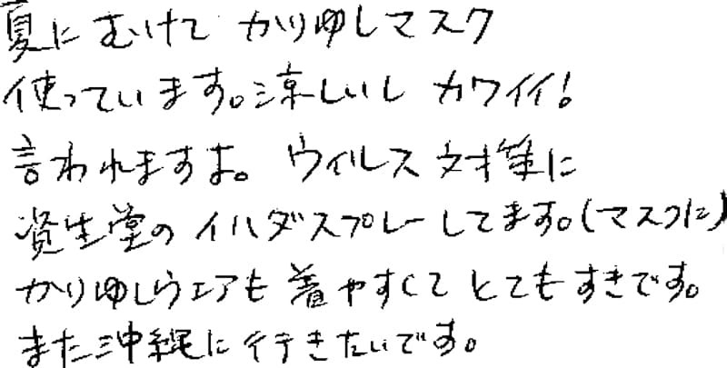 夏に向けてかりゆしマスク使っています。涼しいしカワイイ!言われますよ。ウイルス対策に資生堂のイハダスプレーしてます。(マスクに)かりゆしウェアも着やすくてとてもすきです。また沖縄に行きたいです。