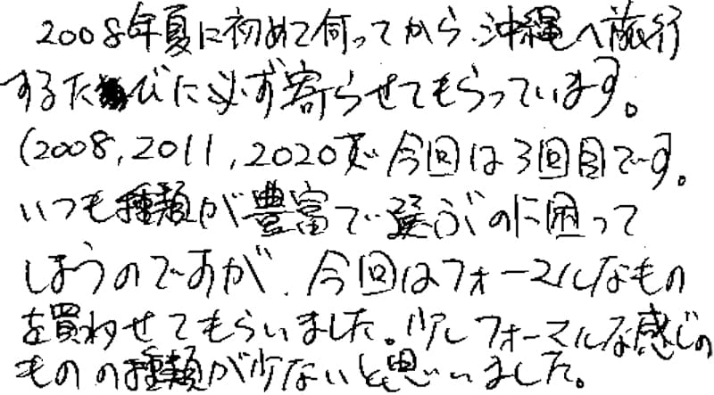 2008年夏に初めて伺ってから、沖縄へ旅行するたびに必ず寄らせてもらっています。(2008、2011、2020)で今夏は3回目です。いつも種類が豊富で選ぶのに困ってしまうのですが、今回はフォーマルなものを買わせてもらいました。少しフォーマルな感じのものの種類が少ないと思いました。