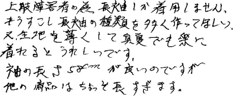 上肢障害者の為長袖しか着用しません。もうすこし長袖の種類を多く作ってほしい。又、生地を薄くして真夏でも楽に着れるとうれしいです。袖の長さ58cmが良いのですが他の商品はちょっと長すぎます。