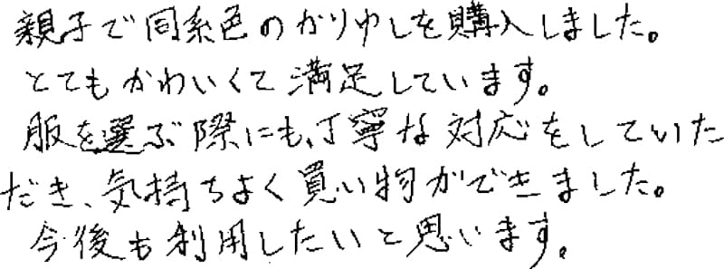 親子で同系色のかりゆしを購入しました。とてもかわいくて満足しています。服を選ぶ際にも、丁寧な対応をしていただき、気持ちよく買い物ができました。今後も利用したいと思います。