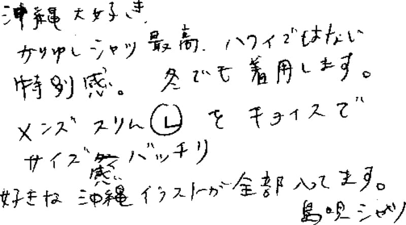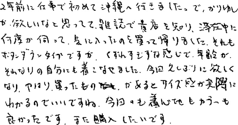 2年前に仕事で初めて沖縄へ行きました。で、かりゆしが、欲しいなと思ってて、雑誌で貴店を知り、滞在中に何度か伺って、気に入ったのを買って帰りました。それもボタンダウンタイプですが、くずれすぎずな感じで、年齢が、それなりの自分にも着こなせました。今回久しぶりに欲しくなり、やはり買ったものがあるとサイズ感が実際にわかるのでいいですね。今回のも着心地もカラーも良かったです。また購入したいです。