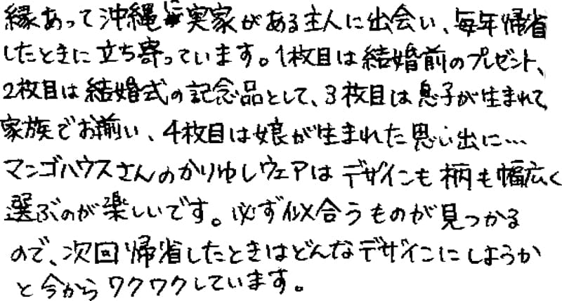 縁あって沖縄に実家がある主人に出会い、毎年帰省したときに立ち寄っています。1枚目は結婚前のプレゼント、2枚目は結婚式の記念品として、3枚目は息子が生まれて家族でお揃い、4枚目は娘が生まれた思い出に…マンゴハウスさんのかりゆしウェアはデザインも柄も幅広く選ぶのが楽しいです。必ず似合うものが見つかるので、次回帰省したときはどんなデザインにしようかと今からワクワクしています。