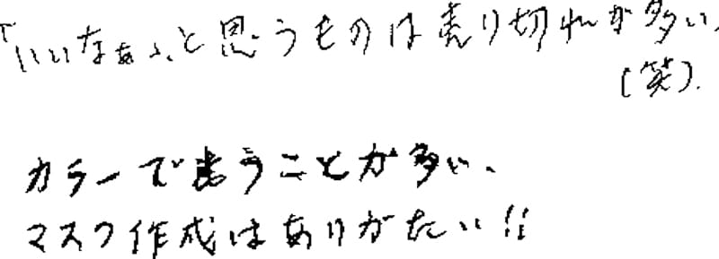 又、先日マスクも購入しましたが、こちらも周りから大高評でした。これからも素敵なデザインの商品、期待しております。