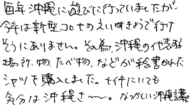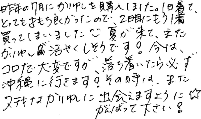 昨年の7月にかりゆしを購入しました。1日着て、とってもきもち良かったので、2日目にもう1着買ってしまいました。夏が来て、またかりゆしが活やくしそうです!今は、コロナで大変ですが、落ち着いたら必ず沖縄に行きます!その時は、またステキなかりゆしに出会えますように☆がんばって下さい!