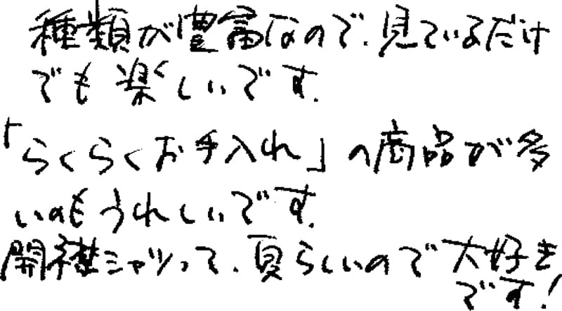 種類が豊富なので、見ているだけでも楽しいです。「らくらくお手入れ」の商品が多いのもうれしいです。開襟シャツって夏らしいので大好きです!