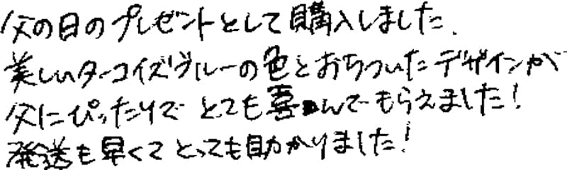 父の日のプレゼントとして購入しました。美しいターコイズブルーの色とおちついたデザインが父にぴったりでとても喜んでもらえました!発送も早くてとっても助かりました!