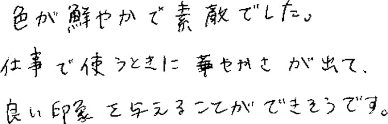 色が鮮やかで素敵でした。仕事で使うときに華やかさがでて、良い印象を与えることができそうです。