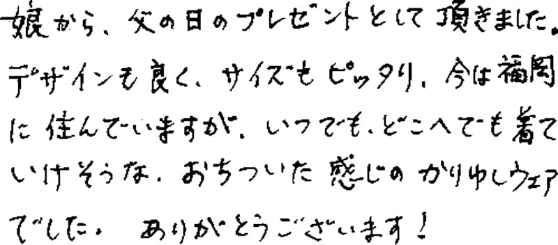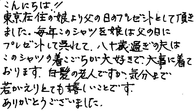 こんにちは!!東京在住の娘より父の日のプレゼントとして頂きました。毎年このシャツを娘は父の日にプレゼントして呉れて、八十歳過ぎの夫はこのシャツの着ごこちが大好きで大事に着ております。白髪の老人ですが、気分まで若がえりとても嬉しいことです。 ありがとうございました。