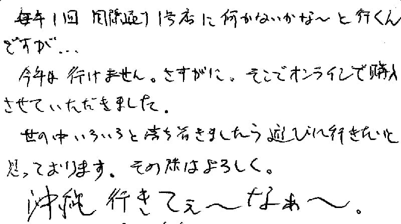 毎年1回 国際通り1号店に何かないかな~と行くんですが…今年は行けません。さすがに。そこでオンラインで購入させていただきました。世の中いろいろと落ち着きましたら遊びに行きたいと思っております。その際はよろしく。沖縄行きてぇ~なぁ~。